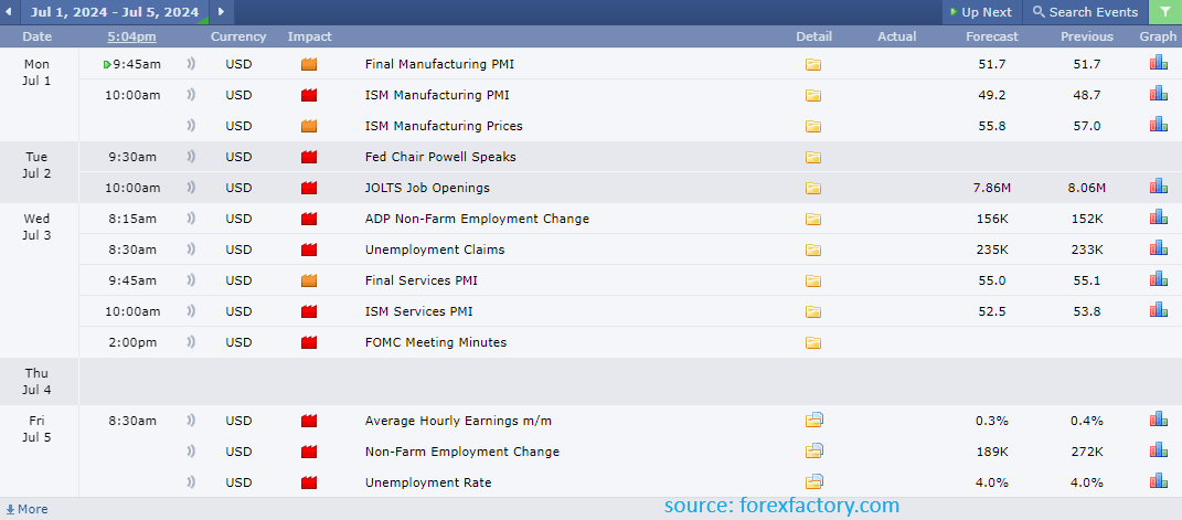 Next week is packed with economic reports from Monday to Friday, except for the July 4th holiday. Monday starts with PMI, followed by JOLTS on Tuesday, ADP Employment Change, Unemployment Claims, and Services PMI on Wednesday. The week ends with NFP Employment Change and the Unemployment Rate on Friday.