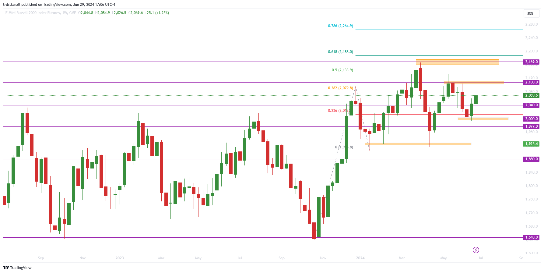 The most difficult price action to nail among the four index futures. The week closed slightly in the red despite an initial attempt to complete a back test of 40130 (39999 high).
